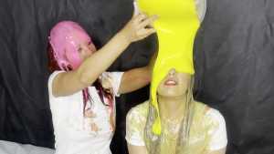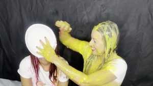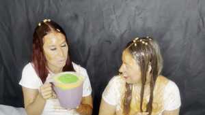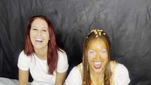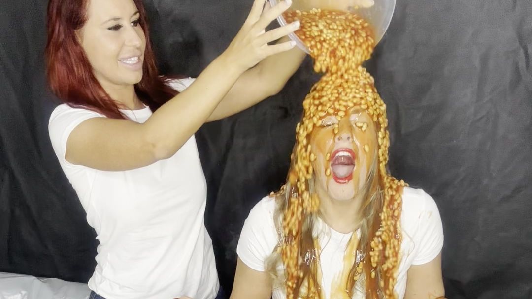 Bri and Jess west go head to head with some a messy trivia quiz around them are some foam pies, colourful custard, beans, rice pudding and gunge. both wearing White t-shirt's, denim jeans, white socks, white trainers.